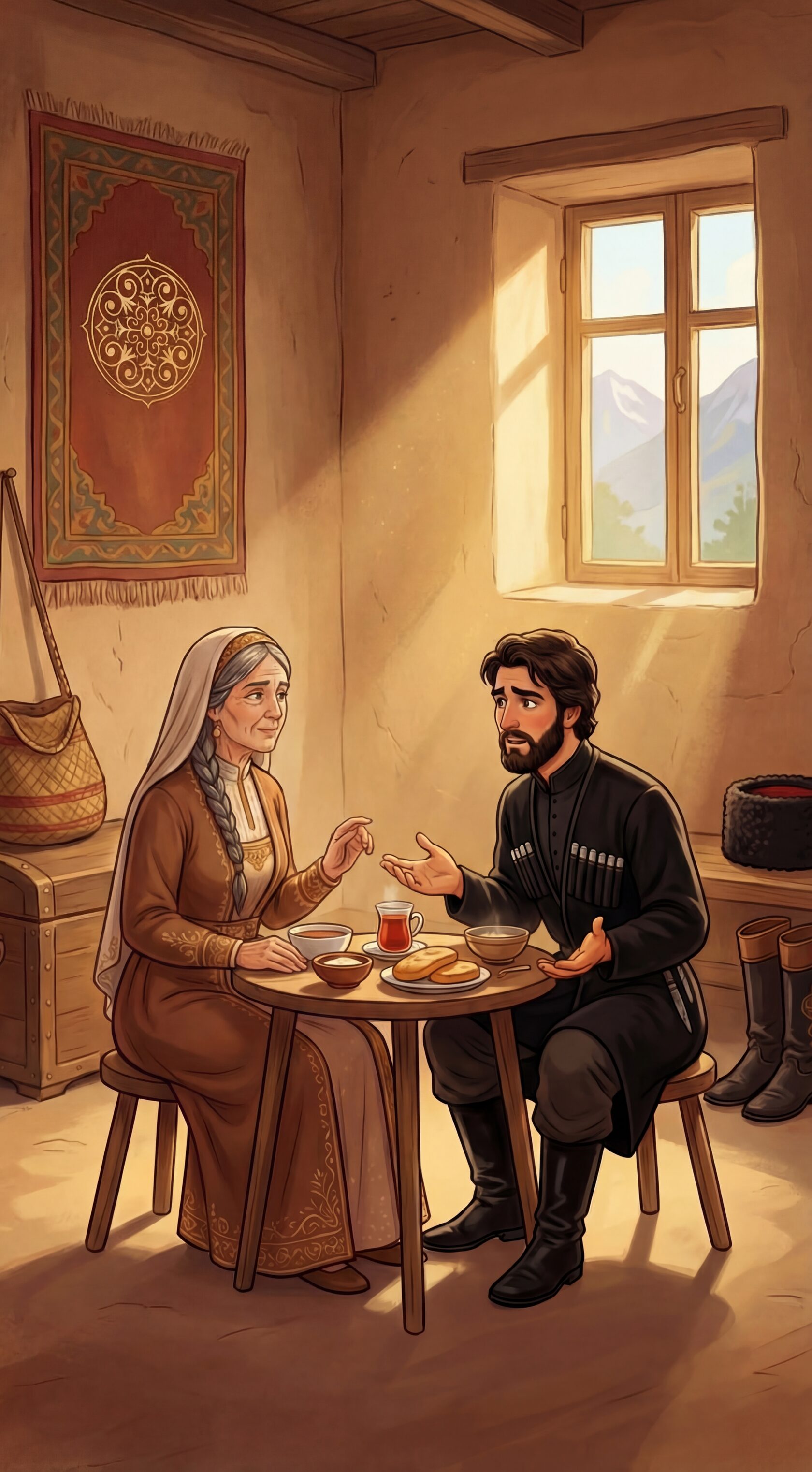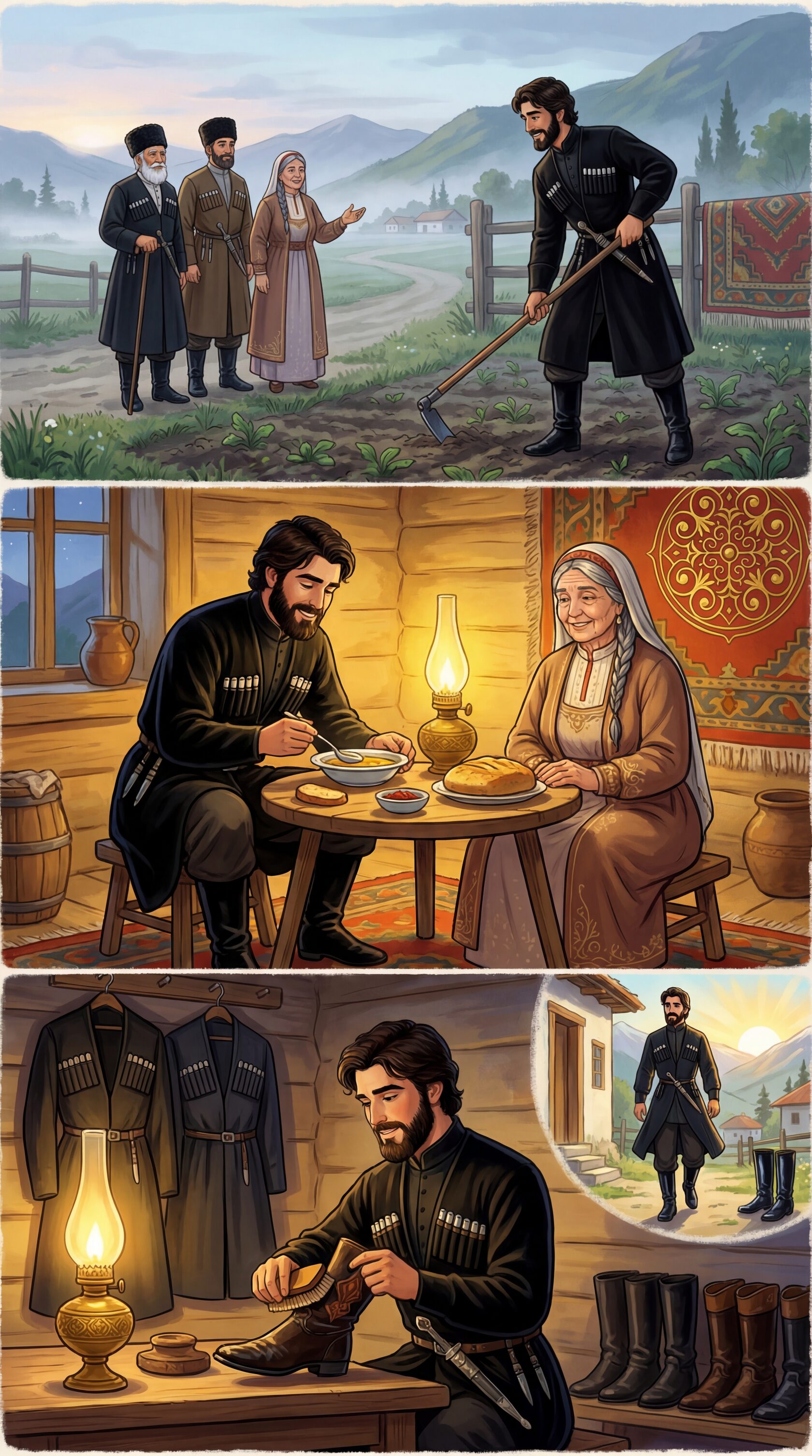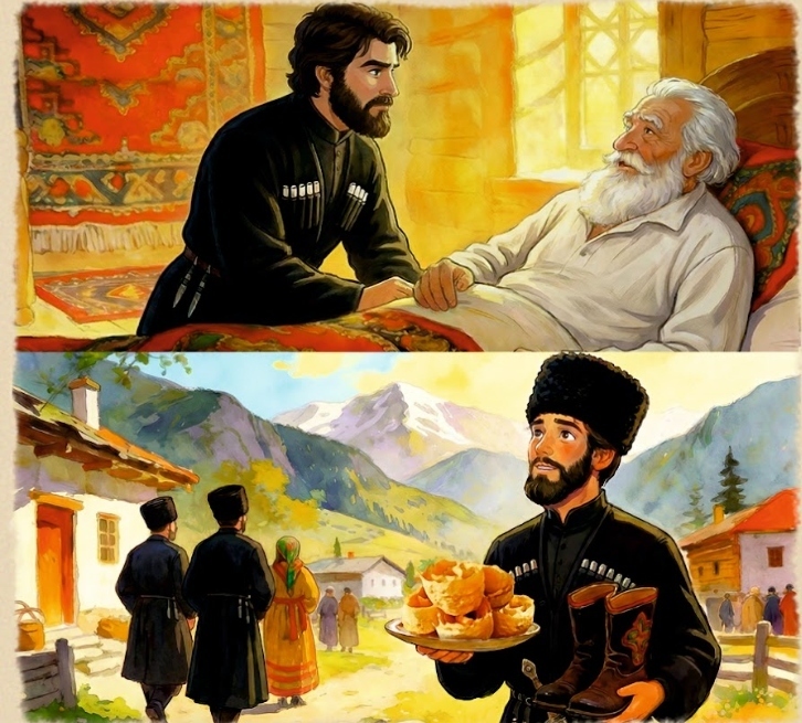 У одного состоятельного адыга был единственный сын — опора и надежда старика. Когда хозяин дома почувствовал, что его дни подходят к концу, он позвал юношу к себе и тихо сказал: «Не оставлю я тебе богатых сундуков золота, но дам три ценных совета. Береги их всю жизнь: Первое: никогда не здоровайся первым. Второе: каждый вечер ешь сладкое. Третье: каждое утро надевай новую обувь».